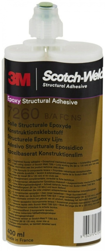 3M™ Scotch-Weld™ 7260 B/A FC-NSist einthixotroper 2-Komponenten-Struktur-EpoxidklebstoffEntwickelt für hochfeste, widerstandsfähige Verbindungen von Metallen und Verbundwerkstoffen. Ideal für anspruchsvolle Industrieanwendungen mit hoher Temperatur und dynamischer Beanspruchung.