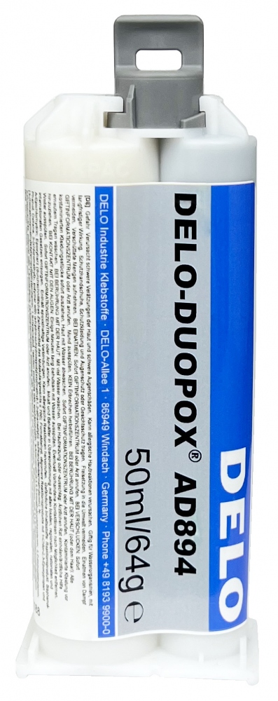 DELO-DUOPOX® AD894(ehemals Delo Automix® AD894) ist einfließfähiger 2-Komponenten-Epoxidklebstoffdas bei Raumtemperatur aushärtet. Es ist ideal für industrielle Klebeanwendungen inMaschinenbau, Elektronikund dieAutomobilsektor. Die schwarze, mit Mineralien gefüllte Formulierung eignet sich zur Anwendung mitDoppelkartuschensysteme.