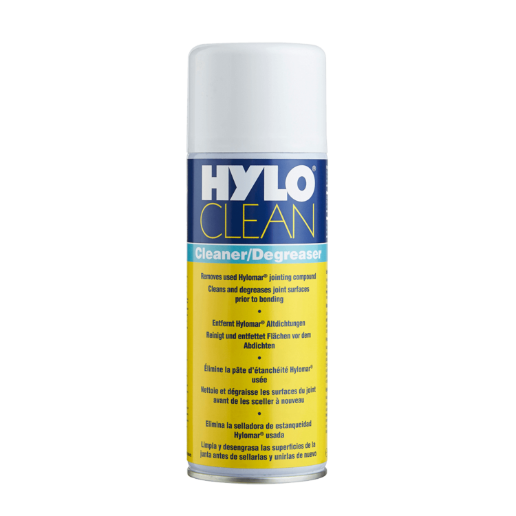 • Hyloclean ist eine speziell gemischte Flüssigkeit, die hochwirksam gebrauchte Hylomar-Dichtungsmasse von demontierten Fugenoberflächen entfernt.