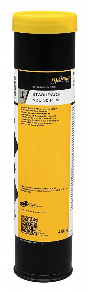 • STABURAGS NBU 30 PTM ist ein Montagefett mit Festschmierstoffanteil. Es ist wasserbeständig und schützt vor Tribokorrosion (Passungsrost). Es hat sich bei Außenanwendungen mit hoher Luftfeuchtigkeit als wirksam erwiesen.