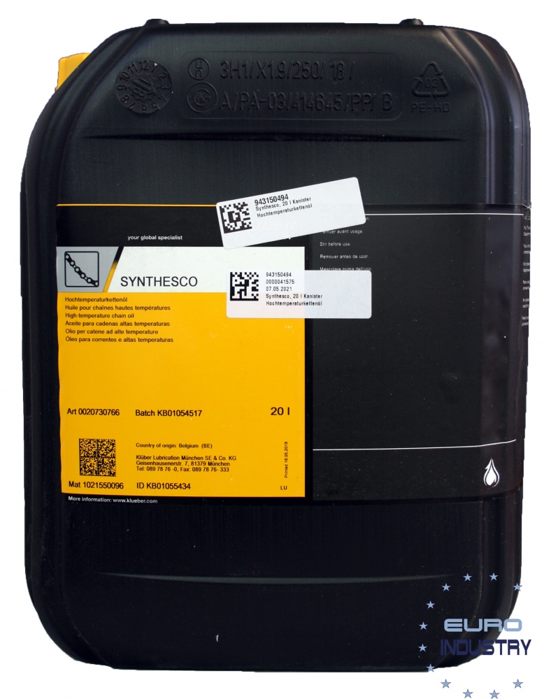 SYNTHESCO ist ein vollsynthetisches Hochtemperatur-Kettenöl mit hoher thermischer Stabilität. Es enthält Festschmierstoffe und ist frei von Rohstoffen auf Silikonbasis.
