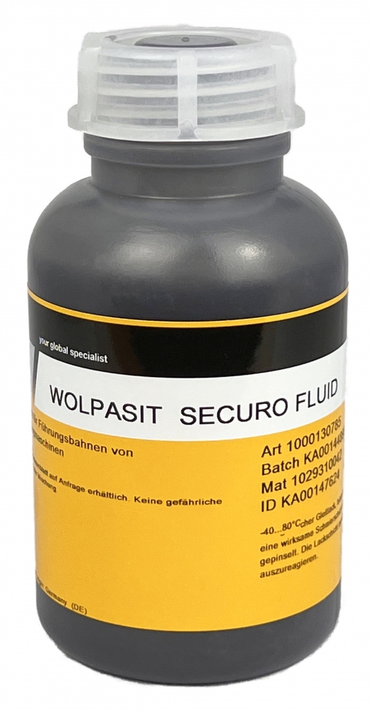 WOLPASIT SECURO FLUID wird gebrauchsfertig geliefert. Die zu beschichtenden Oberflächen müssen frei von Öl, Wasser und Korrosion sein. WOLPASIT SECURO FLUID kann als dünne Schicht aufgesprüht oder aufgestrichen werden. Es dauert ca. 30 Min. um seine Reaktion zu vervollständigen. Anschließend sollten die Führungsbahnen trocken (ohne Öl) eingefahren werden, bis sich eine glänzende, kompakte Schicht gebildet hat. Für den Einlauf sollte eine Geschwindigkeit von < 500 mm/min gewählt werden. Nach dem Einfahren sind die beschichteten Führungsbahnen vor Feuchtigkeit zu schützen. Für den Normalbetrieb sollte das Schmiersystem der Werkzeugmaschine wieder aktiviert werden.