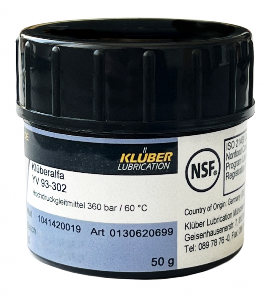 - Klüberalfa YV 93-302 ist ein weißes Hochdruckgleitmittel auf Basis perfluorierter Polyether mit Festschmierstoffen mit guter Benetzungsfähigkeit.