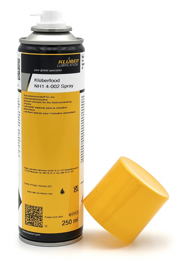 - Klüberfood NH1 4-002 ist ein Spray mit geruchs- und geschmacksneutralen Spezialölen.