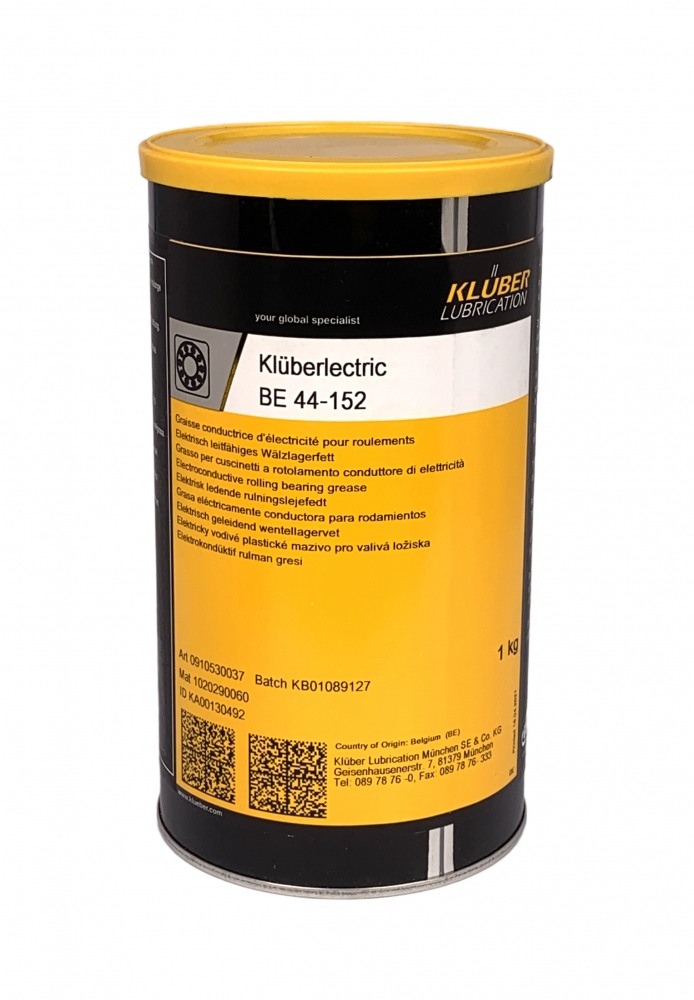 Klüberlectric BE 44-152 ist ein vollsynthetisches Schmierfett auf Basis eines synthetischen Kohlenwasserstofföls, Lithiumseife und dunkler Festschmierstoffe. Aufgrund seiner besonderen Zusammensetzung wird die statische Elektrizität in Wälzlagern durch das Fett geleitet und so eine lokale Spannungsentladung verhindert, die zu schweren Schäden an den Lagerlaufbahnen und Wälzkörpern führen würde.