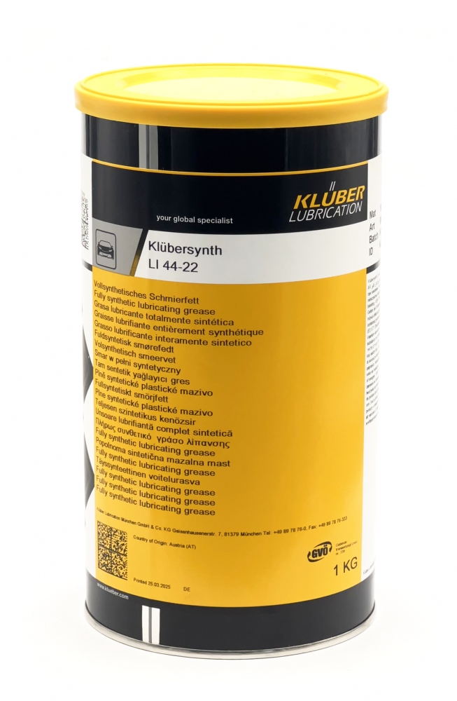 - Klübersynth LI 44-22 ist ein vollsynthetisches, dynamisch leichtes Tieftemperaturfett mit guten Dämpfungs- und Hafteigenschaften sowie Wasserbeständigkeit. Es basiert auf synthetischen Kohlenwasserstoffen, Lithiumseife, Gleitfestschmierstoffen sowie Korrosions- und Oxidationsinhibitoren.