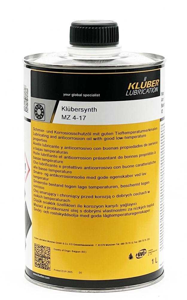 - Klübersynth MZ 4-17 ist ein vollsynthetisches Schmier- und Korrosionsschutzöl mit guten Tieftemperatureigenschaften. Neben dem Korrosionsschutz auch bei Salzwassereinwirkung weist Klübersynth MZ 4-17 gute Verschleißschutzeigenschaften auf.