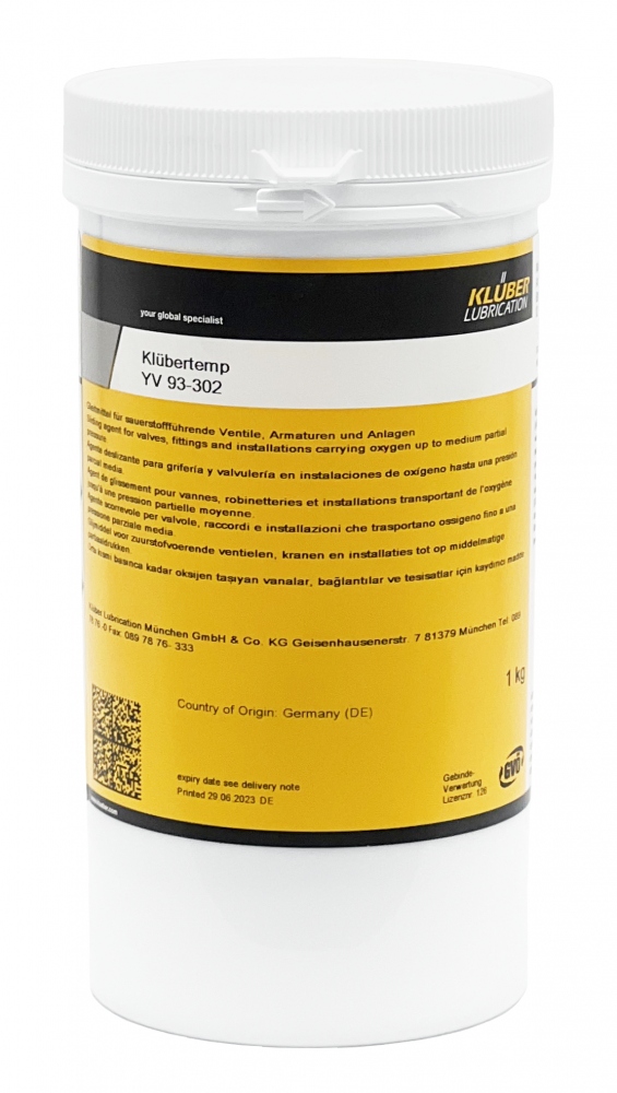 - Klübertemp YV 93-302 ist ein bewährtes Gleitmittel für alle Reibstellen mit geringen bis mittleren Anforderungen und in Kombination mit allen in Gassauerstoffanlagen verwendeten Materialien.