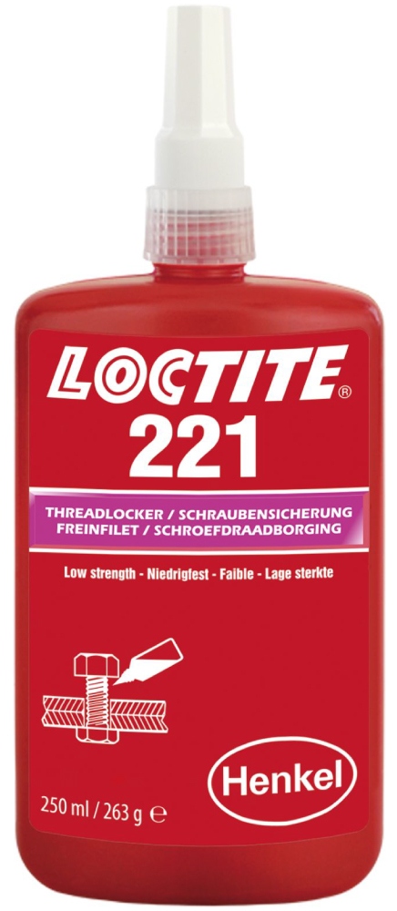 LOCTITE® 221 ist ein violetter, dünnflüssiger 1-Komponenten-Schraubenkleber mit geringer Festigkeit, der sich ideal zum Sichern von Schrauben mit kleinem Durchmesser und Verbindungselementen mit großer Eingriffslänge eignet.