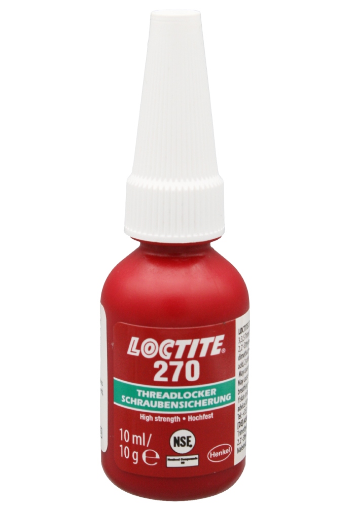 LOCTITE® 270ist eine hochfeste Schraubensicherung für maximale Wirksamkeit beim Sichern und Abdichten von Schrauben, Muttern und Stehbolzen, um ein Lösen aufgrund von Vibrationen zu verhindern. Das Produkt dient zur dauerhaften Sicherung von Baugruppen, die sich nicht lösen dürfen. Es ist nachweislich tolerant gegenüber geringfügigen Verunreinigungen durch Industrieöle, z.B. Motoröle, Korrosionsschutzöle und Schneidflüssigkeiten. Zerlegbar durch Erhitzen auf 300°C.