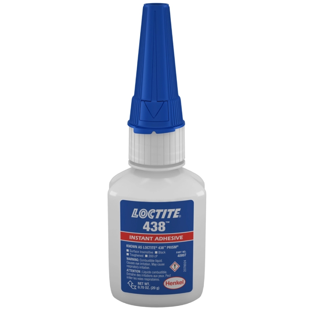 LOCTITE® 438ist ein schwarzer, schlagzäher Sofortklebstoff auf Ethylbasis. Es hat eine Fixierzeit von 10 – 20 Sekunden, eine hohe Schlagfestigkeit und ist flexibel. Es eignet sich zum Verkleben von Kunststoffen, Gummi, Metallen, porösen und saugenden Untergründen sowie sauren Oberflächen. Gute Beständigkeit in feuchter Umgebung.