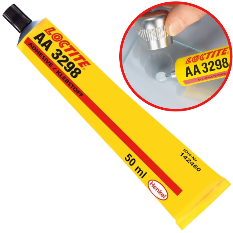 - LOCTITE® AA 3298™ eignet sich zum Verkleben einer Reihe von Materialien, einschließlich Blech und Glas, bei denen eine kontinuierliche oder wiederholte Belastung auftritt (z. B. Möbel,