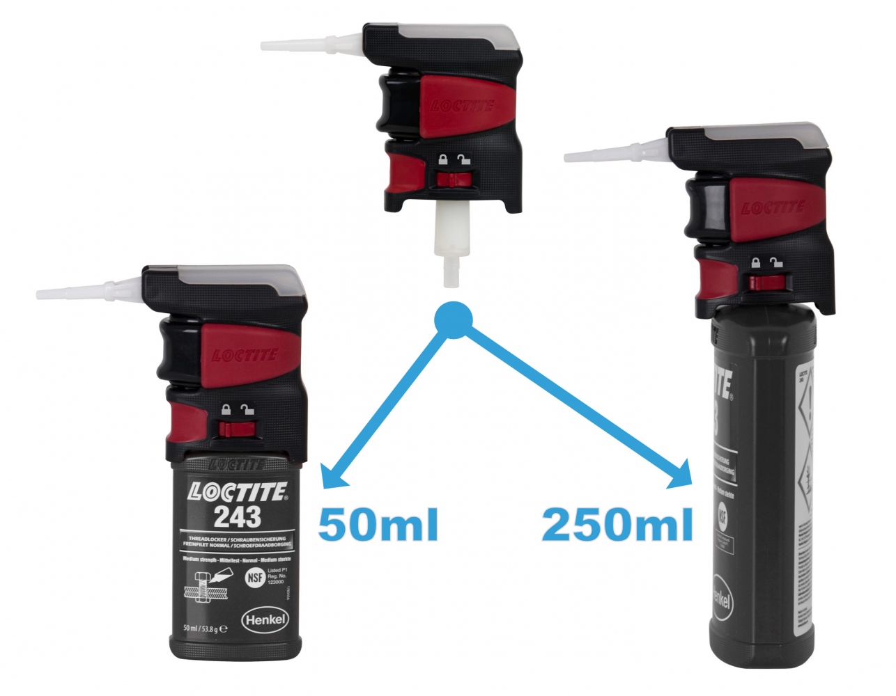 • Keine Montage erforderlich. Passt sowohl auf 50-ml- als auch auf 250-ml-LOCTITE®-Klebstoffflaschen.