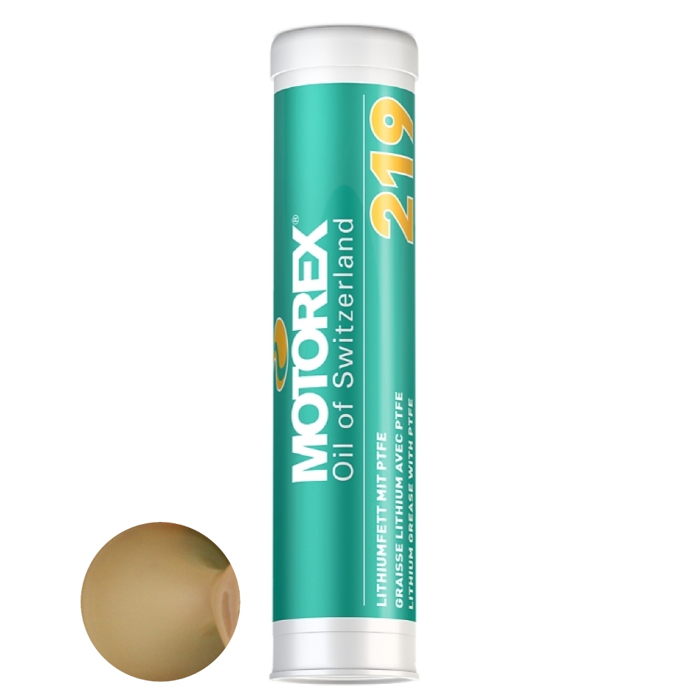 Motorex GREASE 219 (FETT 219) ist ein halbsynthetisches Lithiumkomplexfett. Durch die synergetische Wirkung von PTFE und anderen Festschmierstoffen entsteht ein äußerst haftfestes und formstabiles Hochleistungsschmierfett.