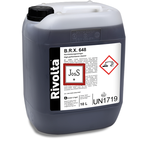 RIVOLTA B.R.X. 648 ist ein leistungsstarker, wasserlöslicher Industriereiniger zur Entfernung hartnäckiger Verunreinigungen wie Farben, Lacke, Fette und Harze von Metallen und Keramik.