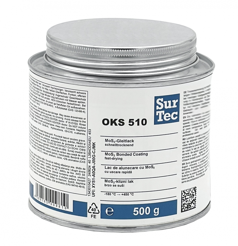 Sur Tec OKS 510 ist eine lufttrocknende Schmierstoffbeschichtung auf MoS₂-Basis zur Trockenschmierung von Maschinenelementen bei vorübergehendem Betrieb und langen Stillstandszeiten.
